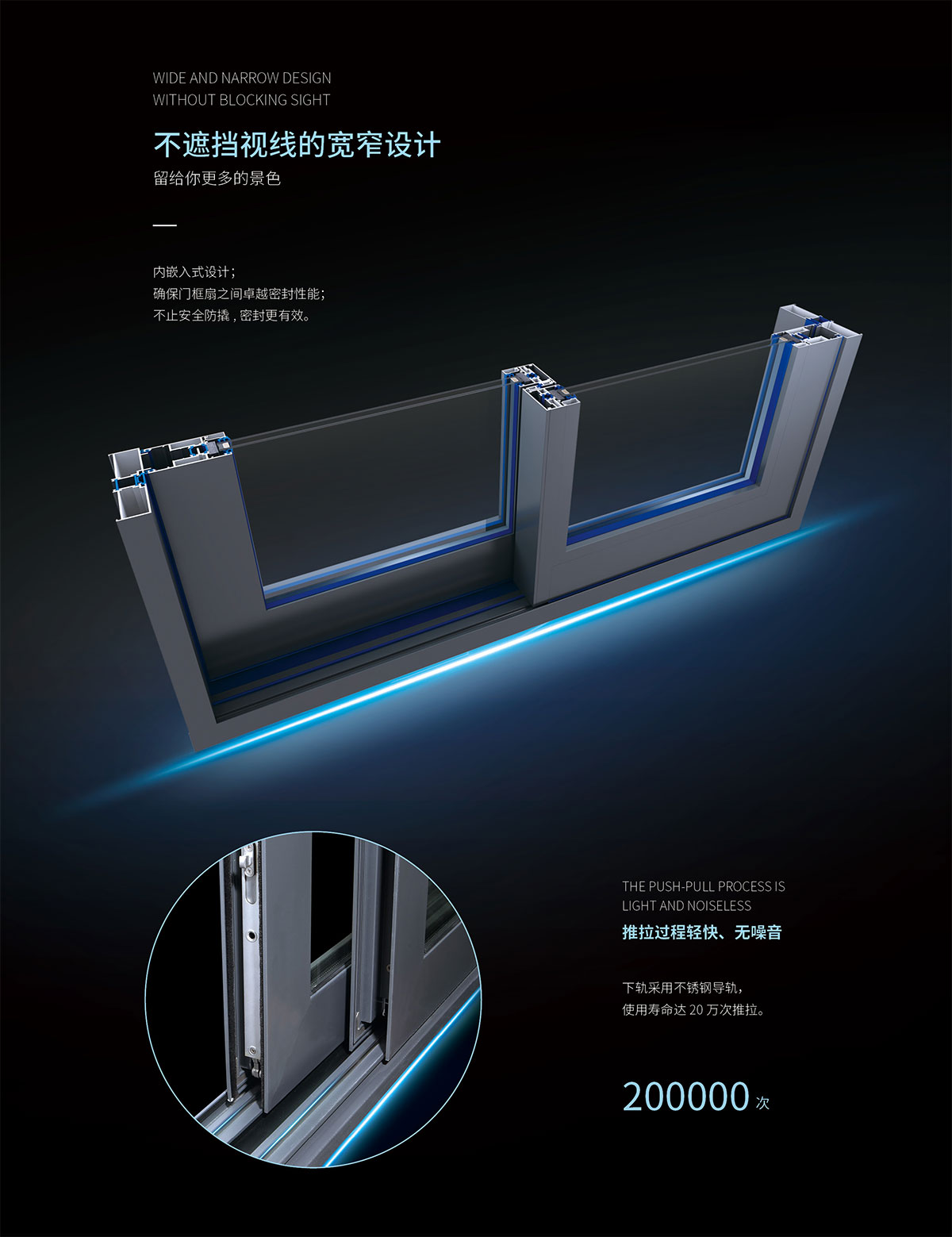 - 采用高品質鋁型材及高品質五金配件,豪華大氣,內置多鎖點的結構設計,令防盜、安全性能更為優越。