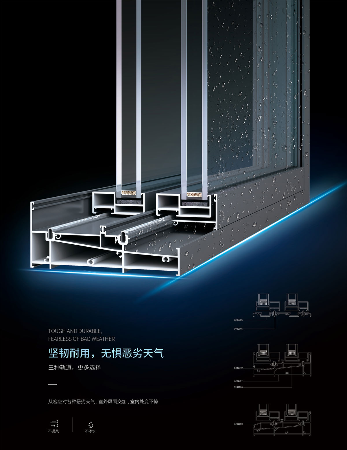 - 采用上導向輪設計,推拉輕松順暢 ,門下框有無障礙設計和高門檻設計兩種方案。